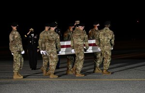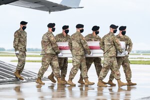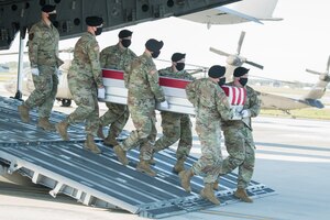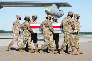 A U.S. Army carry team transfers the remains of Sgt. Christopher W. Curry, of Terre Haute, Ind., May 10, 2020 at Dover Air Force Base, Del. Curry was assigned to 3rd Battalion, 21st Infantry Regiment, 1st Stryker Brigade Combat Team, 25th Infantry Division, Fort Wainwright, Alaska (U.S. Air Force
