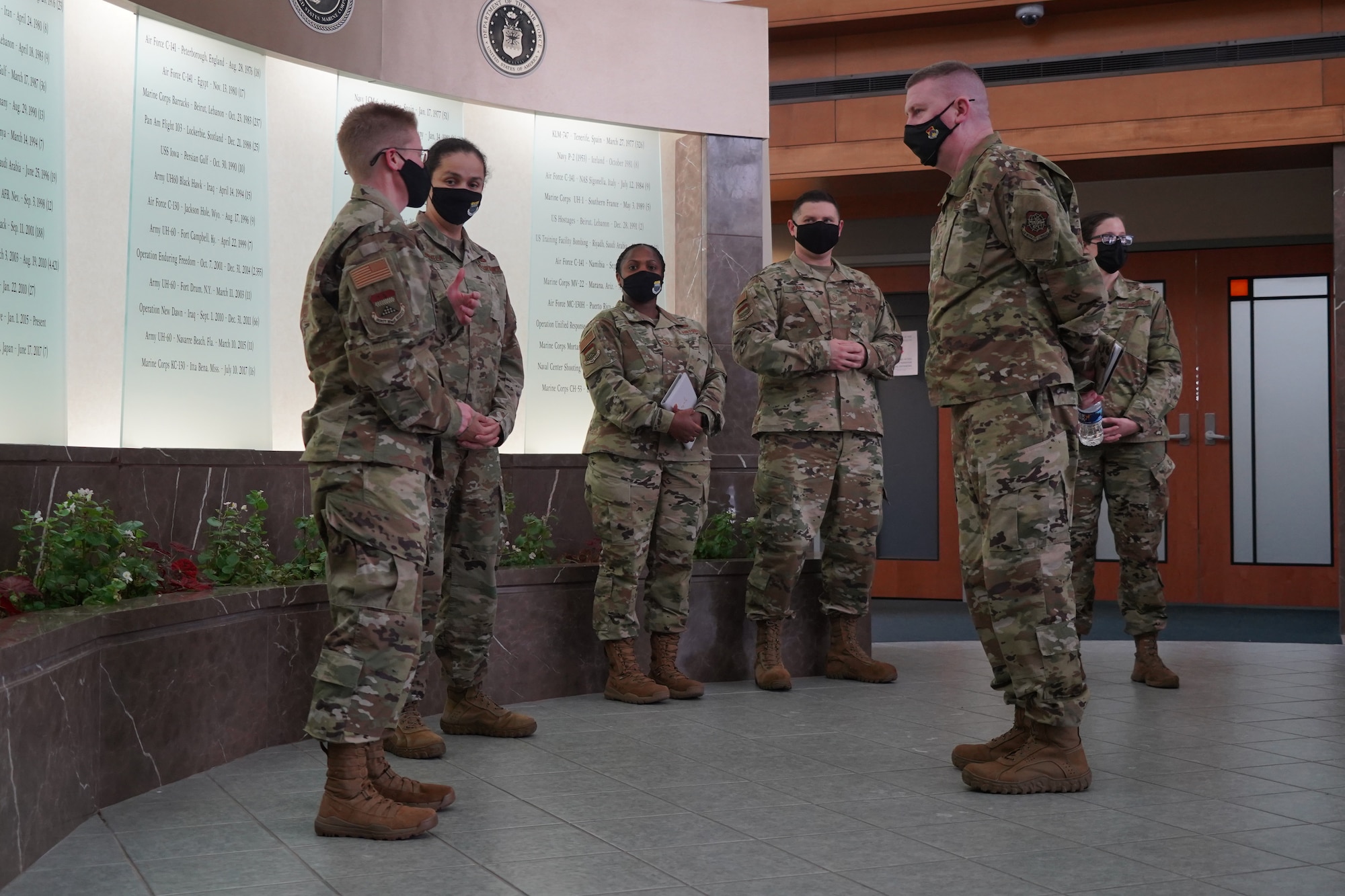 Lt. Col Kris Rennie, Air Force Mortuary Affairs Operations deputy commander, welcomes Chief Master Sgt. Chad Bickley, Command Chief Master Sgt. of the 18th Air Force, during an orientation at Dover Air Force Base, Delaware, Feb. 11, 2021. During his visit Bickley said he was moved by AFMAO’s mission, and expressed his gratitude to the members that serve here. (U.S. Air Force photo by Staff Sgt. Benjamin N. Valmoja)