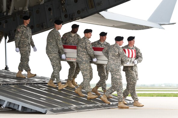 A U.S. Army carry team transfers the remains of Army 1st Lt. Brandon J. Landrum of Lawton, Okla., at Dover Air Force Base, Del., May 7, 2013. Landrum was assigned to the 1st Battalion, 36th Infantry, 1st Brigade Combat Team, 1st Armored Division, Fort Bliss, Texas. (U.S. Air Force photo/Roland Balik)
