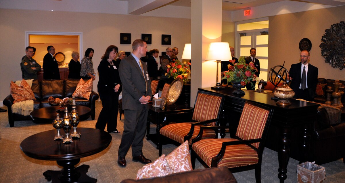 Mr. Trevor Dean, deputy commander of Air Force Mortuary Affairs Operations, gives a tour of the Center for Families of the Fallen to honorary commanders of the 436th Airlift Wing at Dover Air Force Base. The center, which opened in 2010, provides families of the fallen with a comfortable meeting place to meet and gather in a home-like atmosphere before and after attending a dignified transfer. The center is part of the Campus for Families of the Fallen that includes a Fisher House and a meditation pavilion.