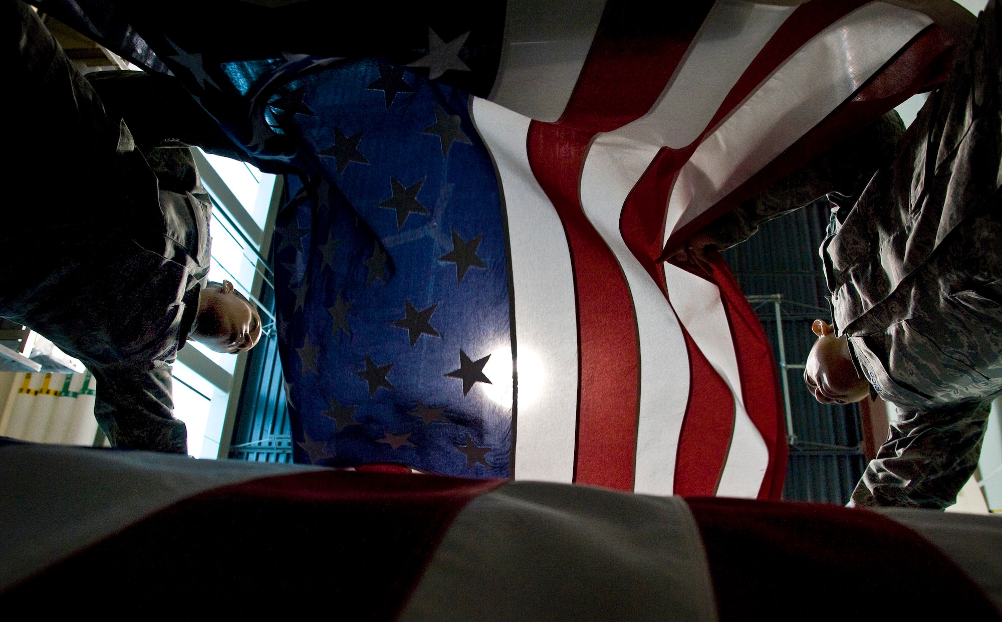 Shipping specialists Staff Sgt. Star Samuels (left) and Tech. Sgt. Willard Rico place a U.S. flag over a casket March 31 during a dry run of shipping process procedures for the dignified transfer of remains at the Charles C. Carson Center for Mortuary Affairs, Dover Air Force Base, Del. The center is the Defense Department's largest joint-service mortuary facility and the only one in the continental United States. Sergeant Samuels is deployed from the 43rd Force Support Squadron at Pope AFB, N.C. Sergeant Rico is deployed from the 60th FSS, Travis AFB, Calif. (U.S. Air Force photo/Staff Sgt. Bennie J. Davis III)
